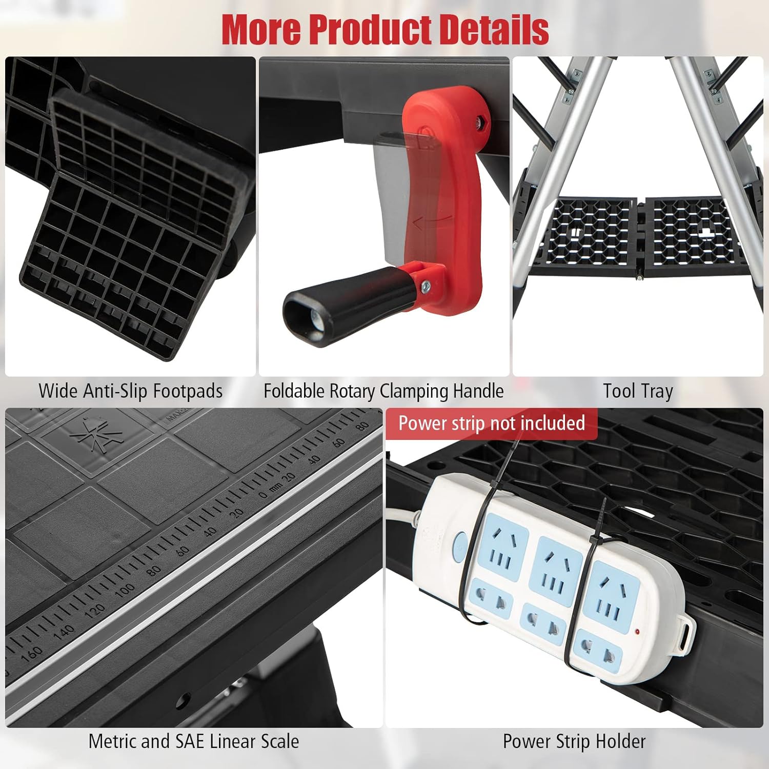 Plz find the reason why you can buy our Portable Flip Top Workbench. Integrated clamping system holds any project tightly in any angle. You can drop 2 sides down to transform workbench into a sawhorse, and also connect 2 or more worktables to create larger work surface. Heavy-duty steel and aluminium frame provides strong support and wide anti-slip foot pads enhance the stability, which also protect the floor. Feature: 2 adjustable heights(56/82cm) for different work needs Great tool for woodworking, measuring, repairing, assembling Power strip holder keeps the power strip in place without clutter Bottom tool storage tray easily collects hardware and other parts Folds down in seconds for easy carrying and space-saving storage Tabletop with storage grooves & measuring guides for convenience Specification: Net Weight: 11.5kg Color: Black + Orange Tool Tray Size: 36 x 34cm (L x W) Material: Metal + Aluminum + PP Weight Capacity of Tool Tray: 9kg Weight Capacity of Sawhorse: 450kg Weight Capacity of Worktable Top: 150kg Folding Dimensions: 63 x 61 x 11cm (L x W x H) Size of Worktable: 82 x 63 x 56/82cm (L x W x H) Size of Sawhorse: 63 x 51/72 x 56/82cm (L x W x H) Package Includes: 1 x Folding Work Bench, 1 x Instruction