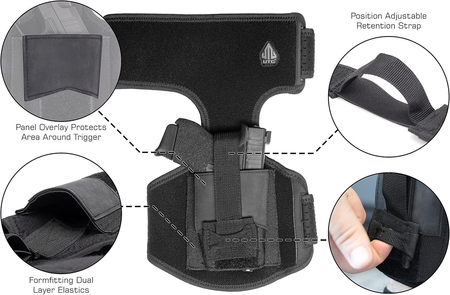 UTG Universal Ankle Holster, Ambidextrous, Position Adjustable Retention Strap, Extended Muzzle Guard, Formfitting Dual Layer Elastic for Greater Compatibility, Padded, Breathable, and Reinforced Neoprene Construction, Synthetic Trigger Guard Panel Overlay, Adjustable Hook-and-loop Calf and Ankle Straps