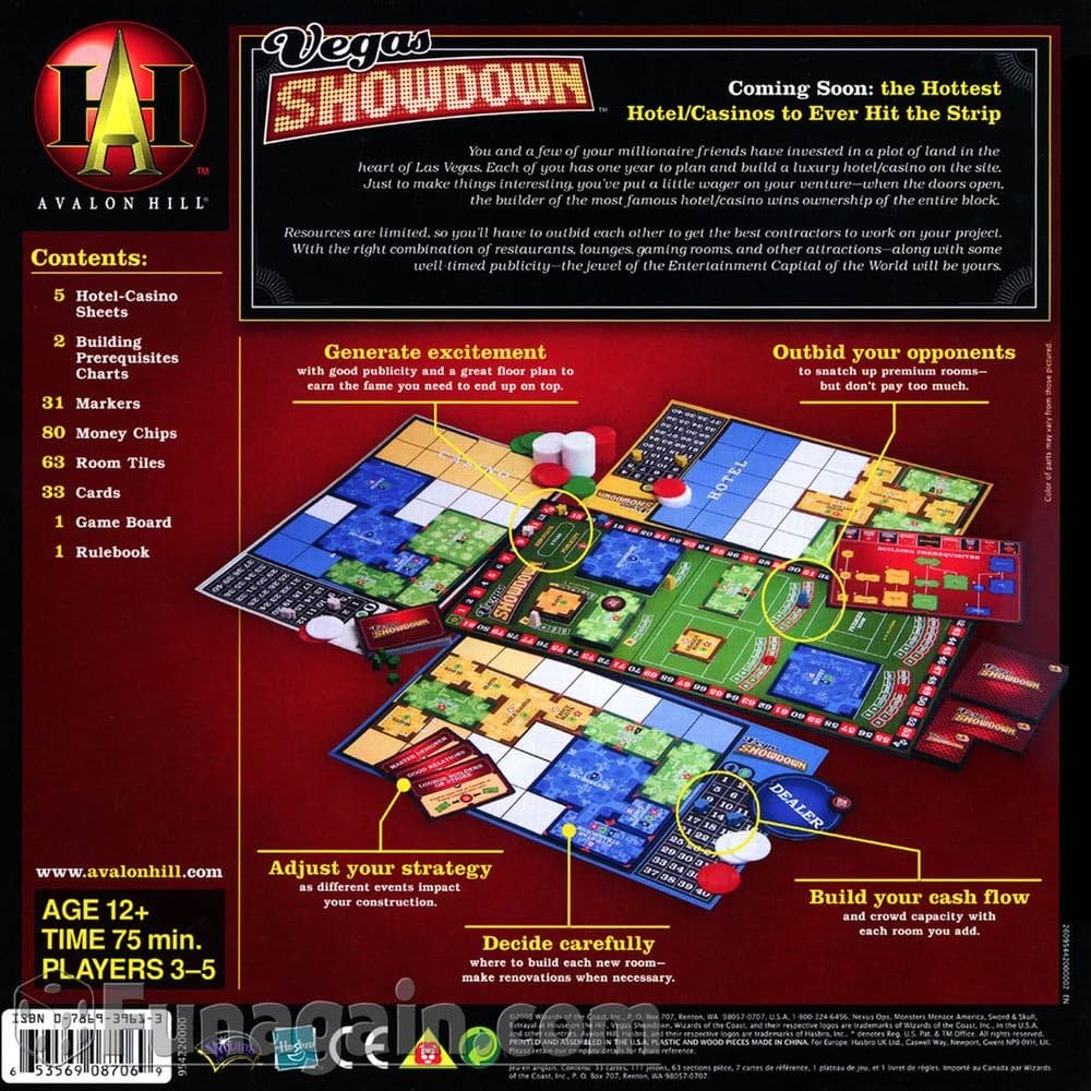 You and a few of your millionaire friends have invested in a plot of land in the heart of Las Vegas. Each of you has one year to plan and build a luxury hotel/casino on the site. Just to make things interesting, you've put a little wager on your venture - when the doors open, the builder of the most famous hotel/casino wins ownership of the entire block. Resources are limited, so you'll have to outbid each other to get the best contractors to work on your project. With the right combination of restaurants, lounges, gaming rooms, and other attractions--along with some well-timed publicity--the entertainment capital of the world will be yours. Victory depends more on skill than luck in this Ero-style resource management game. Vegas Showdown is a sophisticated and challenging game for 3 to 5 players that uses fame to help measure the success of your casino.