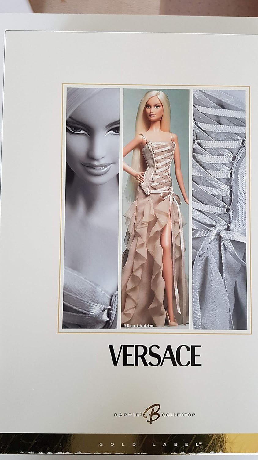 Leading international fashion house, Versace, is recognized around the world for luxury clothing and lifestyle accessories. Couture design, recognizable flair and unmistakable elegance are signatures of the Versace brand. Versace Barbie doll wears an alluring sleeveless taupe gown with a long hip hugging bodice of laced taupe ribbon above ruffles of chiffon falling vertically to the floor creating a sumptuous sense of motion.