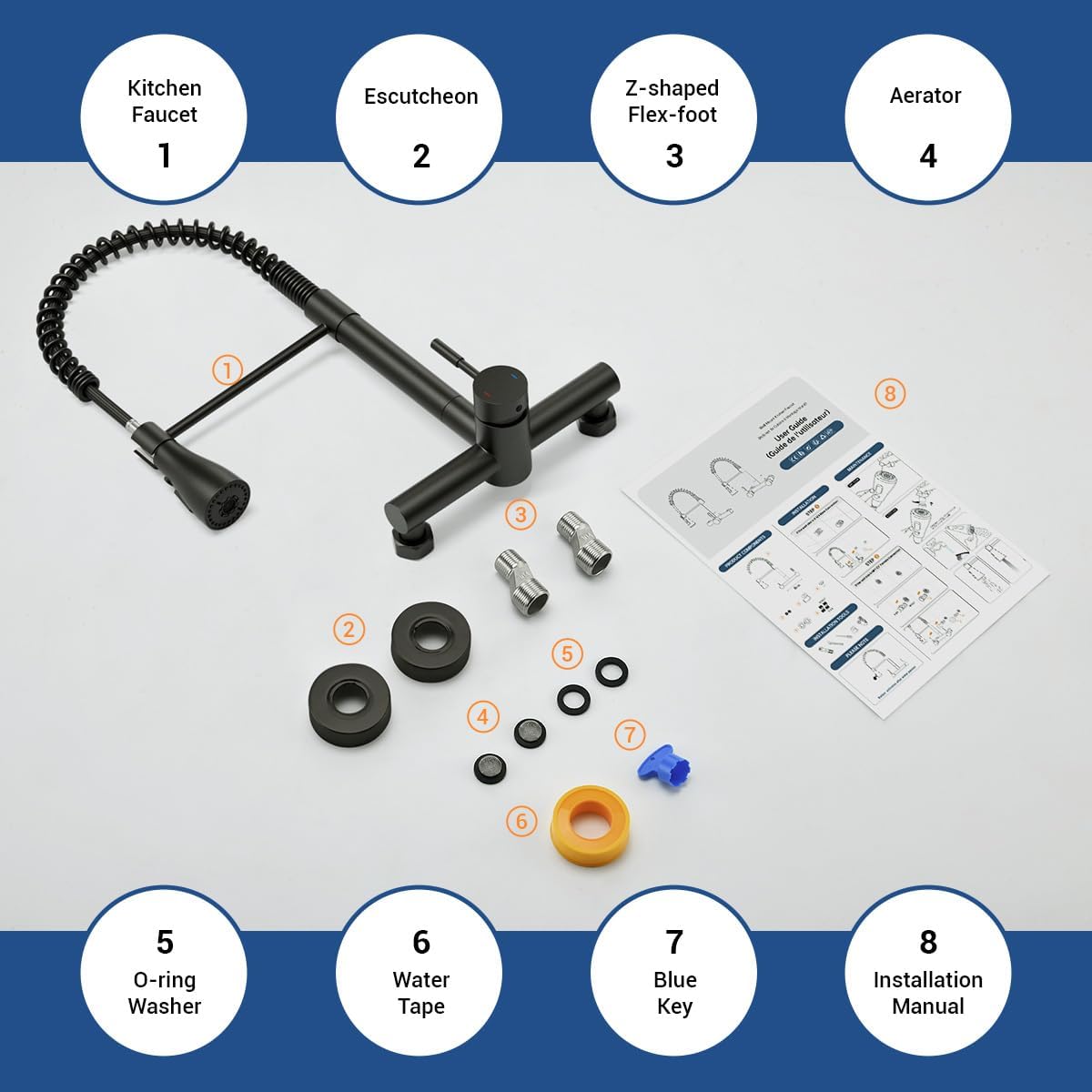| Included Components | Aerator, Installation Hardware, Instruction Manual, NPT 1/2 to G 3/4 Z-shaped adapters, Wall Mounted Kitchen Faucet |